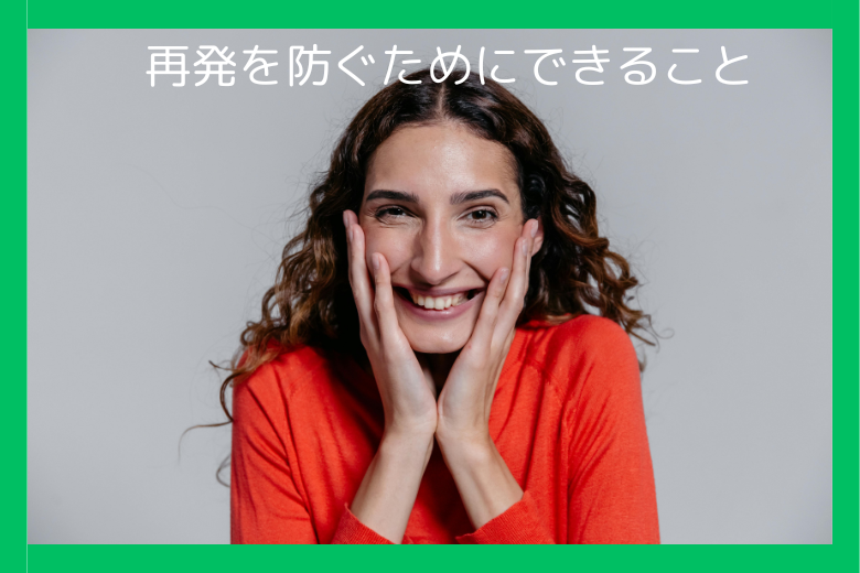 再発の主なリスクとしては、「ストレスの蓄積」「疲労の蓄積」「治療の中断」が挙げられます。これらに対して日常的に対策を行い、自分の心と体の状態を丁寧に見つめながら暮らしていくことが、再発を防ぎ、安定した生活を続けていく上で非常に重要になります。