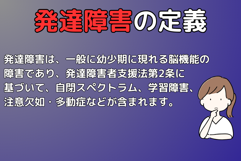 発達障害は、一般に幼少期に現れる脳機能の障害であり、発達障害者支援法第2条に基づいて、自閉スペクトラム、学習障害、注意欠如・多動症などが含まれます。ICD-10ではこれらの障害が「F80」から「F98」に分類され、DSM-5では知的能力障害やコミュニケーション障害、運動障害、チック障害などが該当します。発達障害を持つ人々は、生まれつきの特性が原因で日常生活や社会生活において制約を受けることがあります。発達障害は病気とは異なり、発達の過程における質的・量的な違いや偏りによって生じるもので、行動やコミュニケーションに影響を与えることがありますが、根本的な治療法はまだ存在しません。しかし、適切な支援を受けることで、社会生活上の困難を軽減することは可能です。発達障害は脳の機能障害が原因であり、知的には正常であっても、学校や家庭での適応に困難を抱えることがあります。