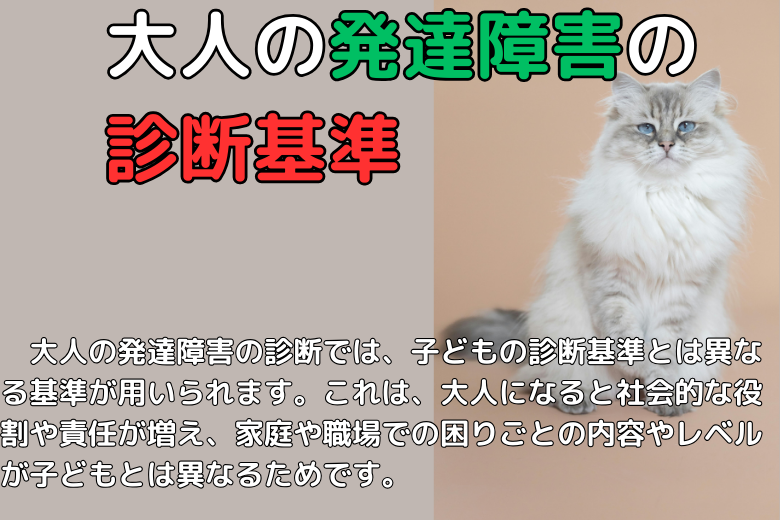 大人の発達障害の診断では、子どもの診断基準とは異なる基準が用いられます。これは、大人になると社会的な役割や責任が増え、家庭や職場での困りごとの内容やレベルが子どもとは異なるためです。大人では、特に以下のような特徴が診断の際に重要視されます。