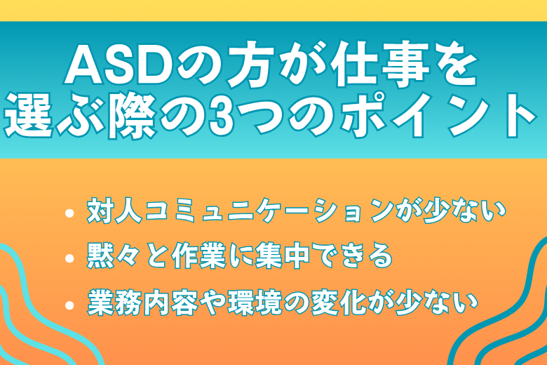発達障害の一種であるASD(自閉スペクトラム症)をお持ちの方の中には、「自分に向いている仕事がわからない」「転職を考えているが、どのような職業が合っているのか知りたい」と悩んでいる方も多くいらっしゃるかもしれません。