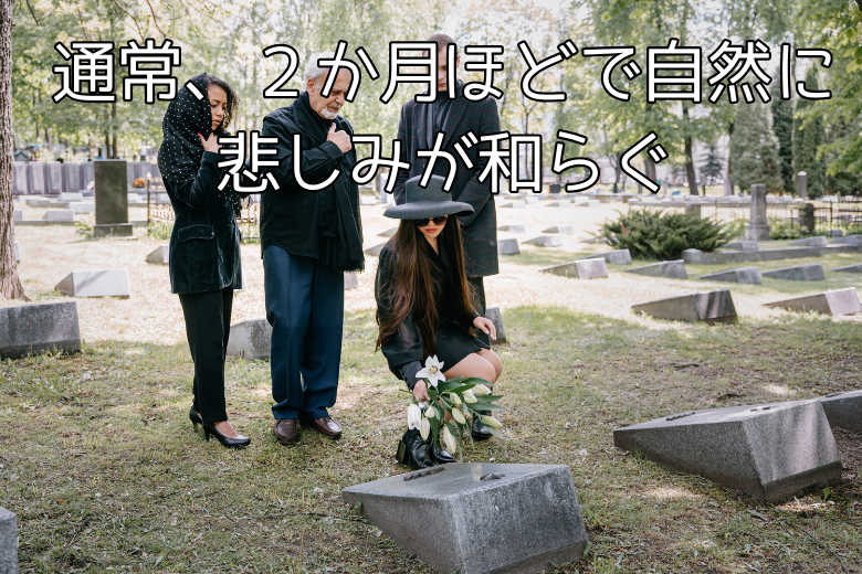 通常、2か月ほどで自然に悲しみが和らぐものです。関係が深ければ深いほど、別れは辛く感じられますが、それはお互いの絆が強かった証拠です。このような心の反応は、死別反応や悲嘆反応と呼ばれます。孤独感や喪失感を伴う波のような感情が日々弱まっていき、通常は2か月ほどで少しずつ落ち着いてきます。最初は理性的に理解しようとしても、感情が追いつかないことが多いですが、葬儀などの儀式を通して少しずつ現実を受け入れていきます。絶望から始まり、やがて良い思い出や感謝の気持ちが芽生え、最終的には懐かしさや感謝を感じるようになります。これを「喪の作業」と呼びます。