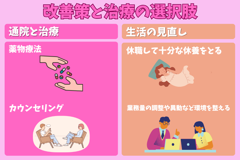 うつ病は早期の医療機関受診によって改善が見込める病気です。以下のような治療や支援を受けることで、症状は次第に和らいでいきます。