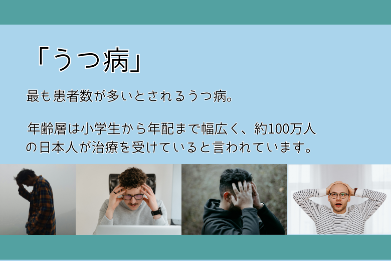 年齢層は小学生から年配まで幅広く、約100万人の日本人が治療を受けていると言われています。うつ病の主な症状は気分の落ち込みを中心に、不安や気力の衰え、不眠、倦怠感、腰痛などの体の痛み、食欲がなくなるといった症状に加え、重症の場合は希死念慮を抱くこともあります。