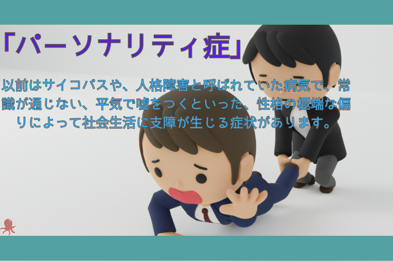 以前はサイコパスや、人格障害と呼ばれていた病気で、常識が通じない、平気で嘘をつくといった、性格の極端な偏りによって社会生活に支障が生じる症状があります。この症状も複数のタイプが存在しますが、中でも境界性パーソナリティ症は見捨てられる不安の強さから、ストーカーや自殺未遂といった過度な行動を起こすことがあります。若年期に発病し、症状が一生続くことも見られます。