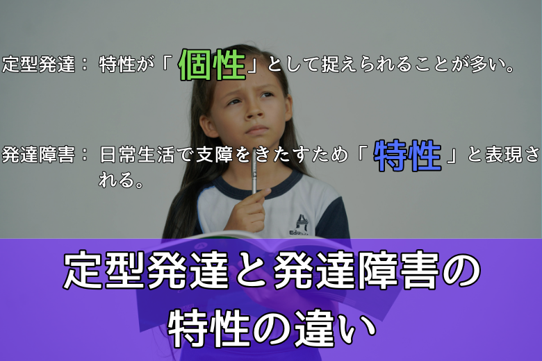 それでは、定型発達の人には特性がないのかという問いに戻ります。実際には、定型発達にも特性は存在しますが、その影響が発達障害の人とは異なるという点がポイントです。ここで、定型発達の方と発達障害の方の特性の捉え方の違いを見てみましょう。
