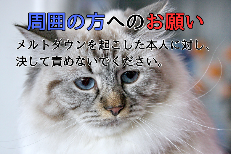 メルトダウンを起こした本人に対し、決して責めないでください。「またそんなことで…」といった否定的な言葉は本人をさらに追い詰めることになります。代わりに、「どんな気持ちだったの?」などと親身に相談に乗り、理解を示す姿勢が重要です。また、本人が冷静さを取り戻した時に話し合うことで、適切なサポートを提供できます。