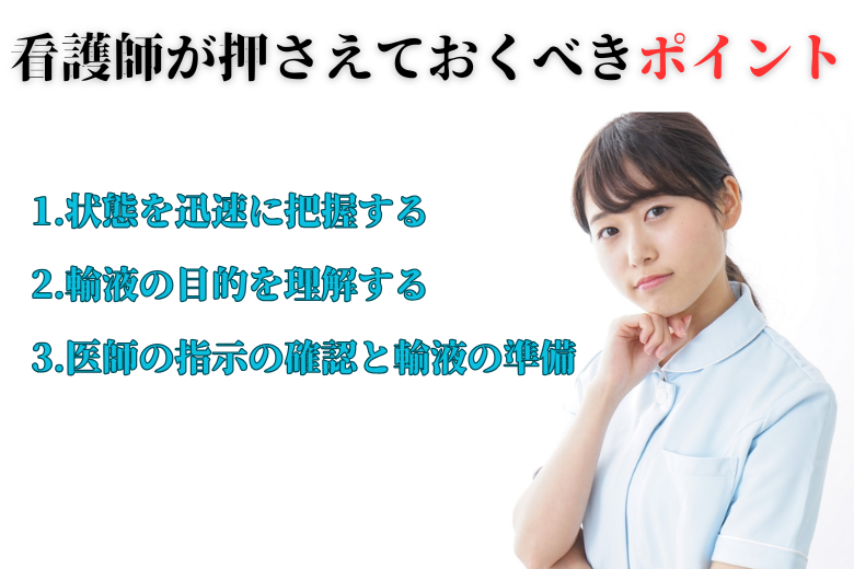 • 救急時や急変時には、使用すべき輸液を医師に確認し、迅速に準備する。