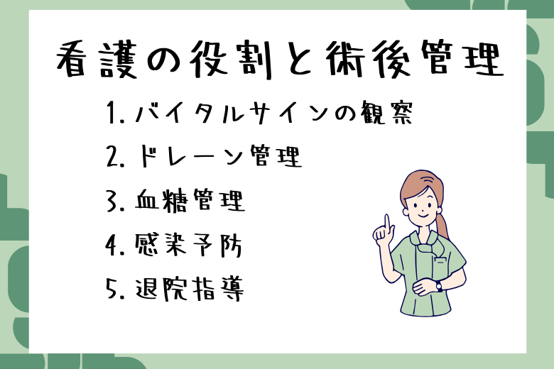 • 看護師としては、ドレーン管理やバイタルサインの観察、血糖値の測定など、術後管理を丁寧に行う必要があります。