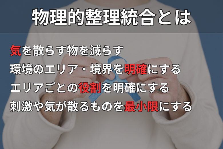 物理的整理統合は、TEACCHプログラムの一環であるStructured Teachingの構造化のアイデアの一つで、以前は「物理的構造化」とも呼ばれていました。