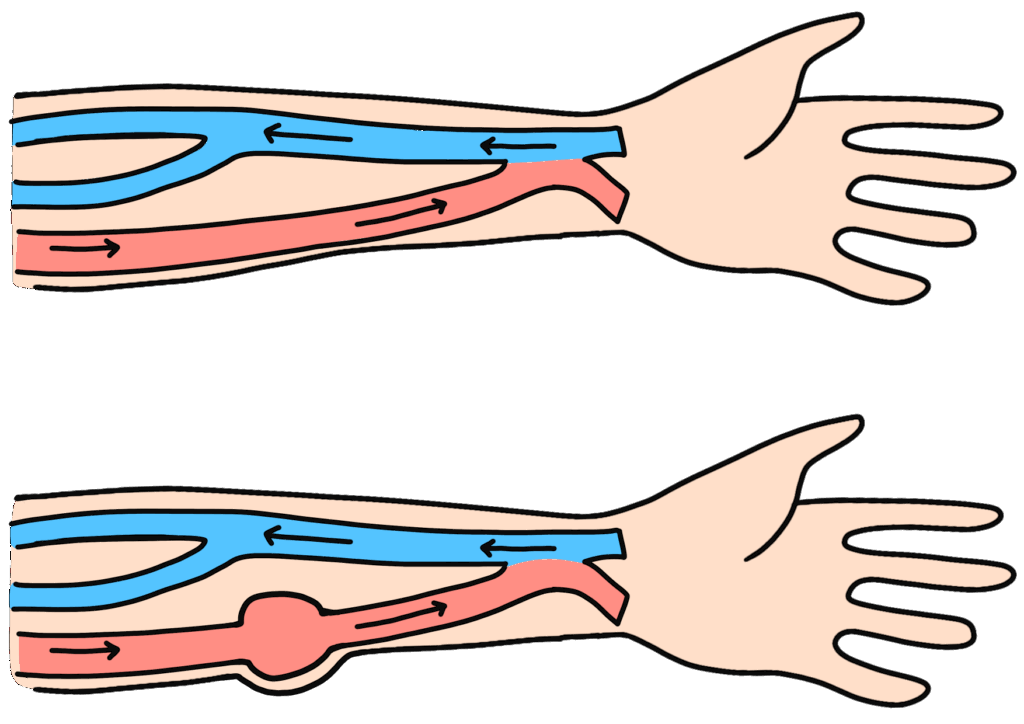 内シャントでは頻回の穿刺が必要となるため、血管に負担がかかります。この結果、血管壁が盛り上がり、こぶが形成されることがあります。こぶが破裂すると、大量出血につながる可能性があり、生命の危機を招く場合もあるため、日々の観察が重要です。