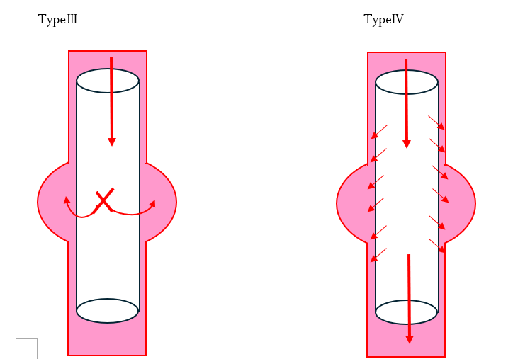 • TypeⅢ: ステントの破損や接合部からの血流漏れ。