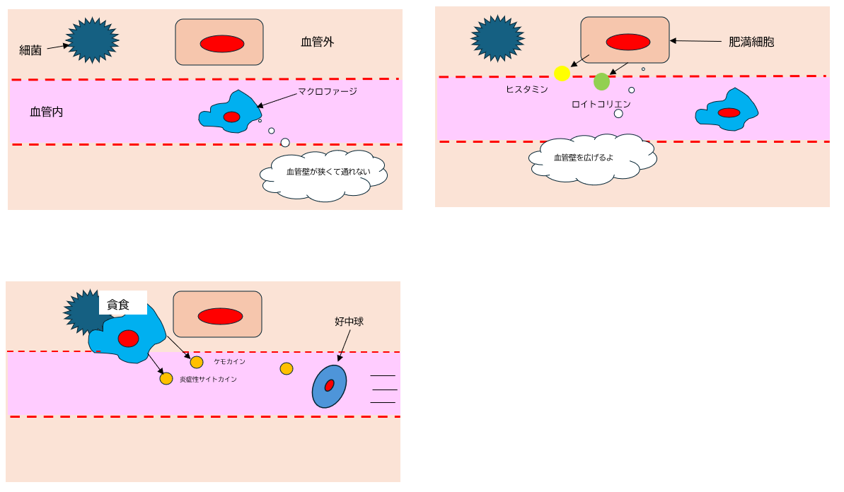 細菌の侵入により、体内の肥満細胞(マスト細胞)からヒスタミンやロイトコリエンが放出されます。これにより、血管が拡張し(ヒスタミンの作用)、血管の透過性が亢進(ロイトコリエンの作用)します。この反応によって、血液中の白血球が感染部位に移動しやすくなります。