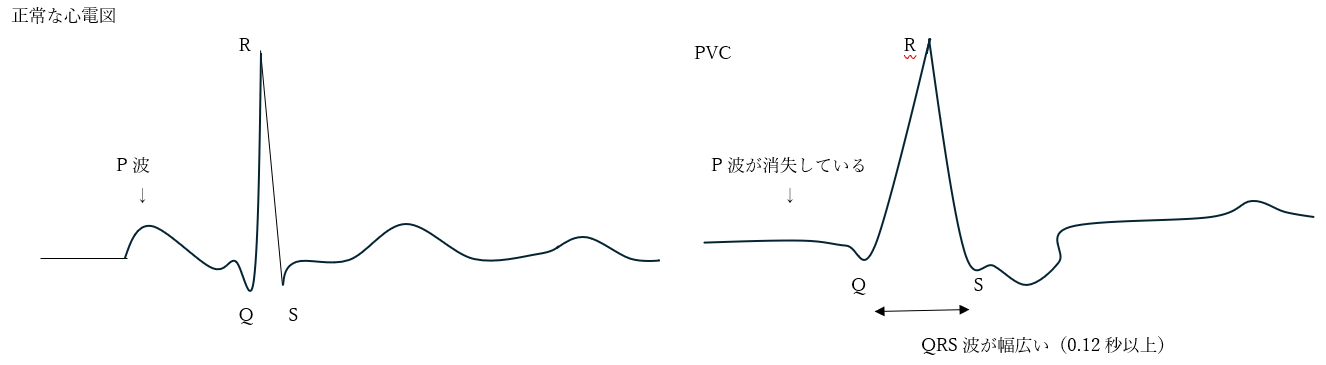 しかし、PVCでは、洞結節以外の心室から異常な電気刺激が発生し、通常よりも早いタイミングで心室が収縮します。これが心電図に以下の特徴的な波形として現れます(図参照):