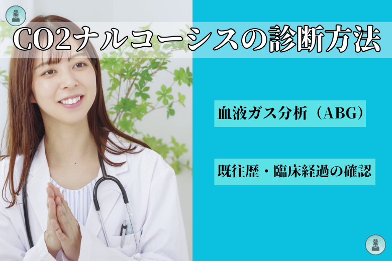 CO2ナルコーシスの診断には、動脈血ガス分析(ABG: Arterial Blood Gas)が必須です。