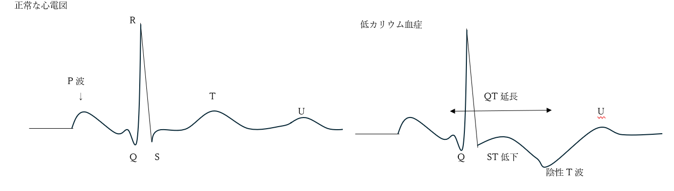 • 低カリウム血症は不整脈を引き起こすリスクがあるため、心電図の変化に注意が必要。