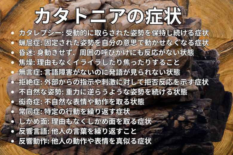 カタトニアの症状には以下のものがあり、これらのうち3つ以上が当てはまるとカタトニア症候群と定義されます。