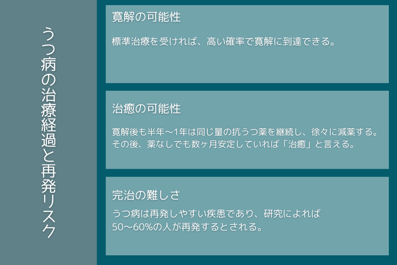 うつ病は再発しやすい疾患であり、研究によれば50〜60%の人が再発するとされる。