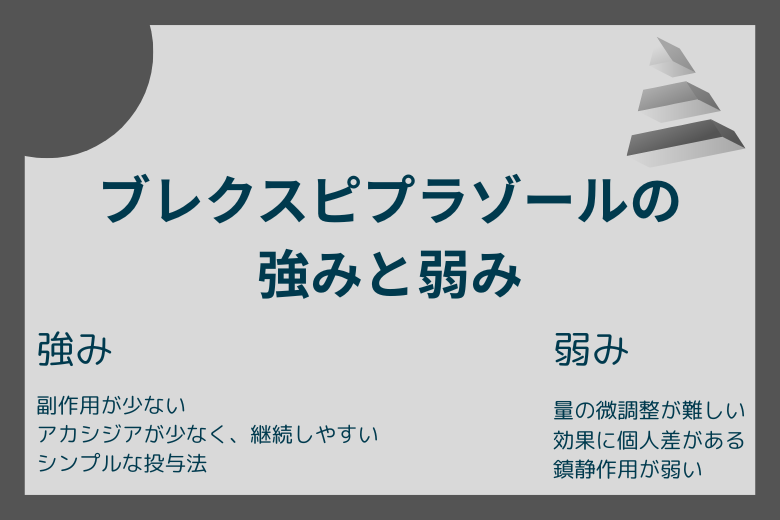 特に、アリピプラゾールでは問題視されることが多かったアカシジアが軽減される点は、患者さんが薬を続けやすくするために大きなメリットとなります。