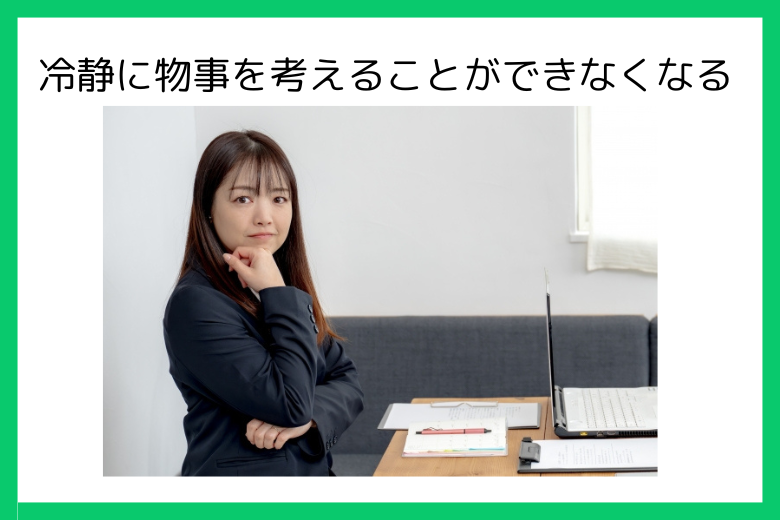 例えば、ちょっとしたミスを「すべてが終わった」と感じたり、人から何気なく言われた一言にひどく傷ついてしまったりと、感情の揺れが大きくなります。物事を論理的に整理する力が弱まり、「考えすぎて動けない」「考えれば考えるほど苦しくなる」といった状態に陥ります。