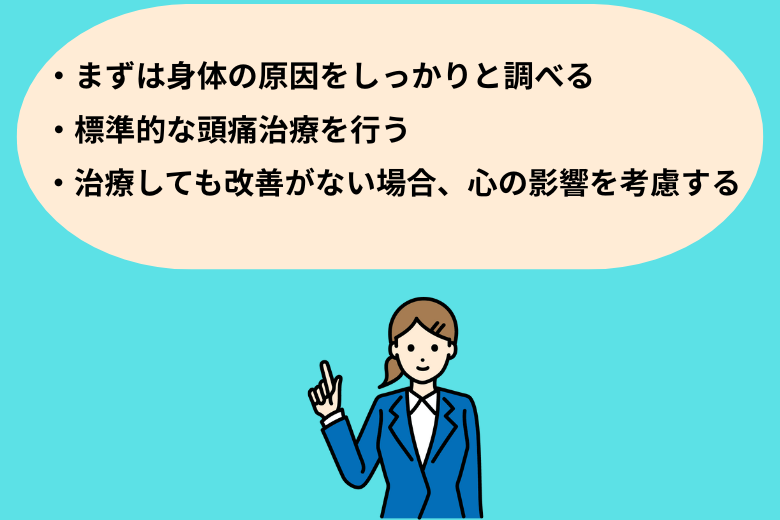 うつ病が背景にある場合には、心療内科や精神科での診断と治療が効果を発揮し、頭痛そのものも改善することがあります。